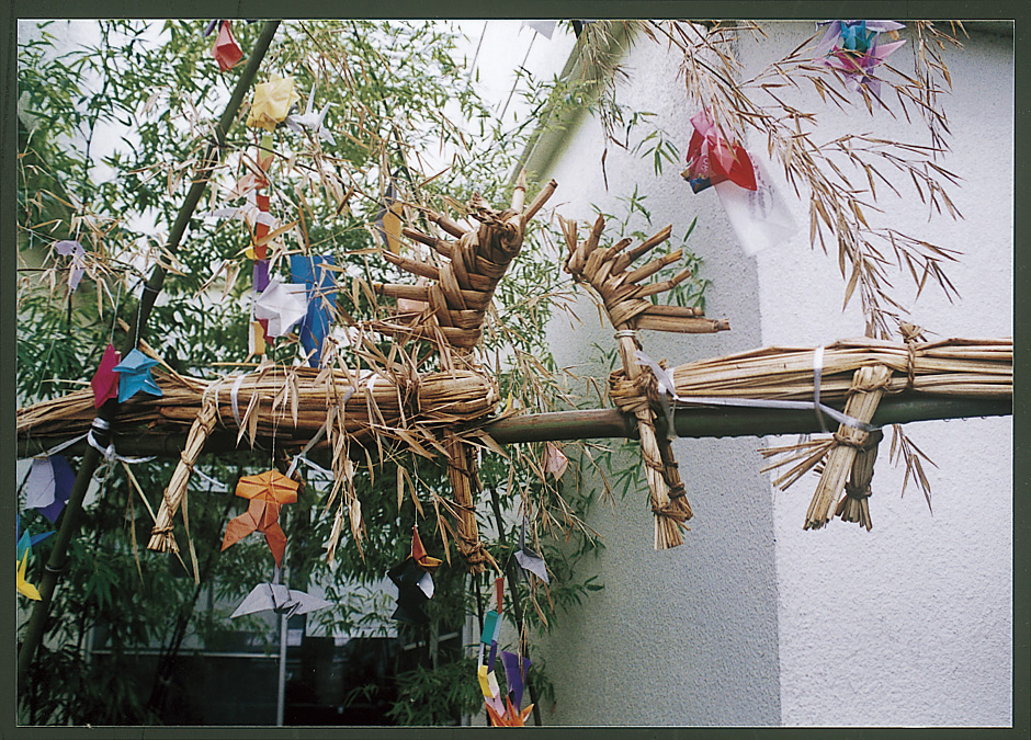 マコモで七夕馬を作り吊す。以前は七夕後、馬を川へ流したが今は燃やしている。