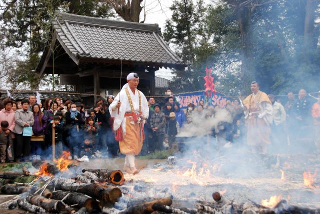 | 概要 | 光恩寺は、約1200年前に開かれたと伝わる古刹です。日本で最初の女医である荻野吟子の生家から移築した長屋門(国登録文化財)や、阿弥陀三尊像(県重文)など数多くの文化財があります。春季不動尊大祭は、僧侶による読経や護摩供養が行われ、裸足で火の上を渡る「火渡り」の荒行は有名で、一般の人も僧侶に続いて参加することができます。また、秋季不動尊大祭では、秋の実りを感謝し、大般若の法要、護摩法要のほか、インドの伝統舞踊が行われ、異文化の雰囲気を味わうことが出来ます。 【不動尊大祭】千代田町 |