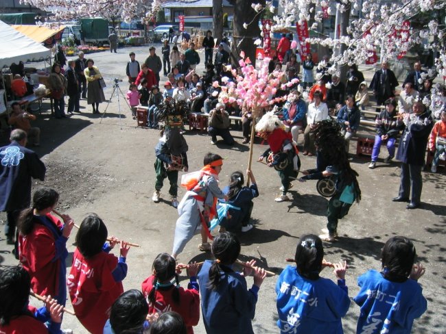 概要 | 中山道新町宿、笛木村に350年の歴史ある稲荷流阿久津派の獅子舞である。鎮守の諏訪神社では、天下泰平、五穀豊穣を願う獅子舞を奉納、また氏子町内で舞う等、盛大な祭りが行われた。戦時中は一時中断、戦後復帰して大勢の若者が加わった時代もあったが、昨今では後継者である若者の参加不足と指導者の高齢化。平成9年から子供会を対象に「獅子舞教室」を始め、平成16年~平成23年の8年間は新町第二小学校3年生を対象に総合学習時間で概ね総勢400人に笛と舞の指導を続け、発表会を開催。結果として神社の獅子舞奉納や「高崎市市制110周年記念獅子舞大会」にも大勢の生徒が参加した経緯から、今後の後継者としての立上がりを期待する現状である。 【新町諏訪神社の獅子舞】高崎市 |