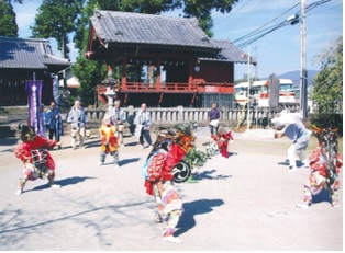 概要 | 永禄9年(1566)9月、武田晴信(信玄)が堅城箕輪城を落城させたとき、領地(里見地域も含む)一帯に武田氏の守護神であった諏訪神社を建立させ、神事芸能として獅子舞を奉納させたのが始まりと云われている。はじめは村に一社として上里見下の原に建立され、春秋2回の祭典が行われていたが、宝永3年(1706)上神の諏訪の原、東光寺西隣り、下里見西向井二子塚、八丁目の南高地の五箇所にそれぞれ諏訪神社が建立された。それによって各地区に獅子舞が分散普及されたと云われている。 獅子舞の発祥依頼の経過については、 明らかではないが、時代の移り変わりとともに中断したりして継続されてきたようである。各地区にあった獅子舞も後継者不足等により、里見地区と、上神地区の2つの獅子舞だけである。戦時中は国策上中断された。 昭和51年になって郷土芸能無形文化保存の風潮が高まり、 「神山下町・新井田獅子舞保存会」が結成された。その後、全戸加入の保存会として各戸より会費を徴収し保存会の活動を継続している。 円周流に属しており、輪になって踊るのが特徴で、独特な型をした流暢な舞が多い。 また、この獅子舞は「お天気獅子」の別称があり、いかなる悪天候にもこの獅子舞を出すと直ちに快晴になると云われている。 【神山下町新井田中獅子舞】高崎市 |