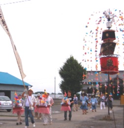 〔写真は板倉町教育委員会提供〕右端に7~8mの華やかな万燈が立てられています。幟を持つ人の後ろに花笠を持つ人が4人、笛を吹く人が3人、そして獅子頭を被り鞨鼓太鼓を腹部に付けた3人、その後ろに村役や世話人耕地の人々が続きます。