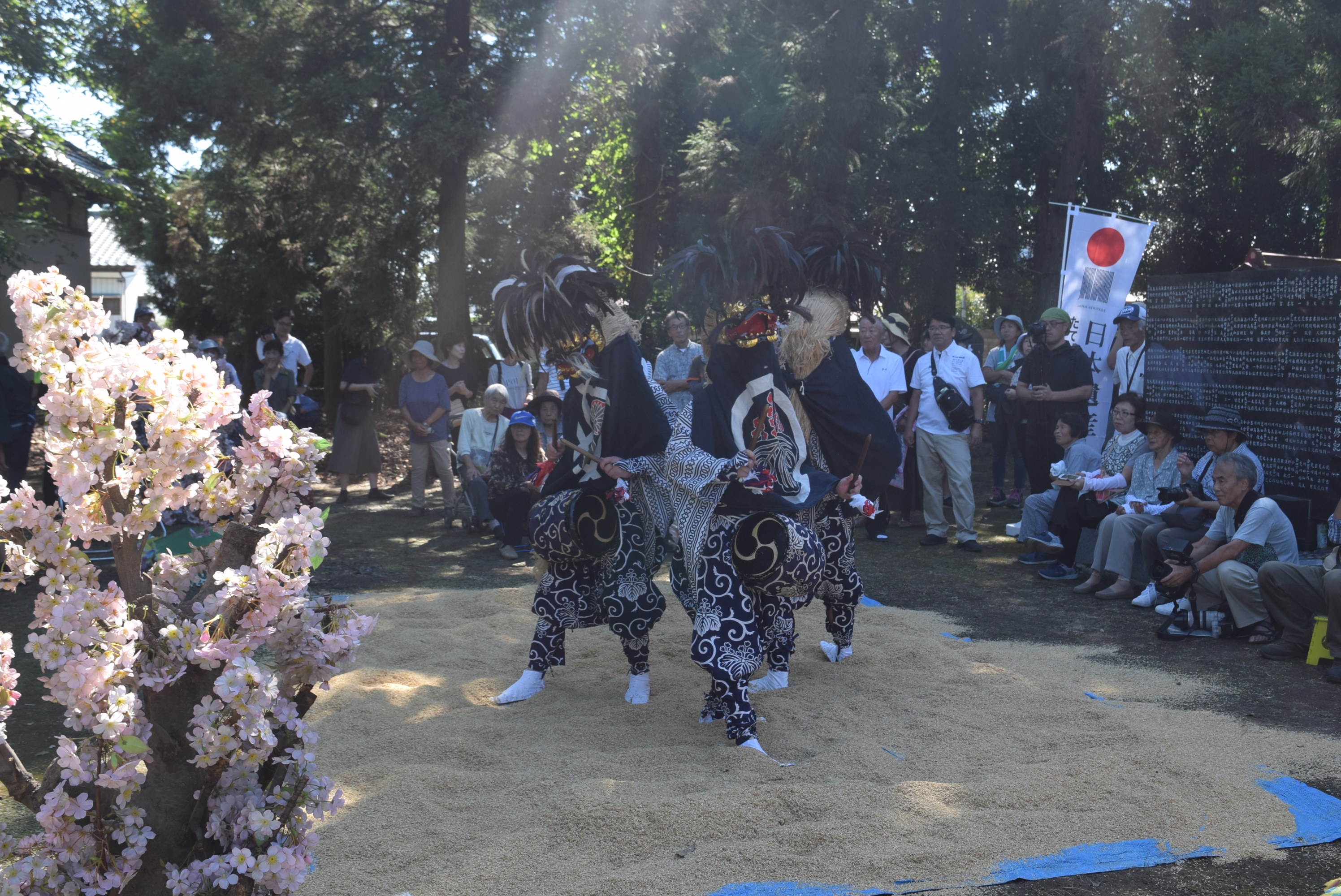 | 概要 | 江戸時代中期、武州忍の下中条より伝えられたという。その年の五穀豊穣に感謝し厄病神を追い払う祭事のため、以前は豊作の年のみに奉納された。奉納日には花棒、獅子、笛方などが行列を整え、雷電神社社殿前での棒の仕合や獅子舞が奉納される。その後、再び行列を整え、地区内の八坂神社等を経由し、最後に雷光寺で奉納する。平成5年(1993)に市指定重要無形民俗文化財に指定された。 【上三林のささら】館林市 |