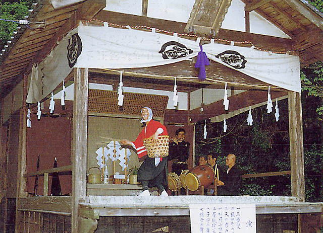 概要 | 賀茂神社に伝わる神楽は宮比講社神楽と呼ばれるもので、文化12年(1815)に当時の神官である飯塚伊豆正が発起したと言われている。神楽には式舞と狂舞があり、ともに十二座で計二十四座となっている。とくに、狂舞の「屑紙拾い三番叟」は他に見られないめずらしい神楽となっている。明治維新で一時中断されたが、明治15年(1882)ころ再興された。その後、昭和40年代に衰退しかかったが、昭和48年(1973)に神楽保存会が組織され、青年有志が古老から受け継ぎ、毎年春と秋の例祭に奉納されている。 市指定重要無形民俗文化財(昭和49年1月21日指定) 【賀茂神社太々神楽】桐生市 |