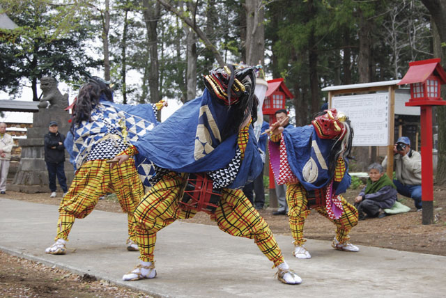 概要 | 1人立3匹獅子舞で、栃木県日光市今市で起こった文挟(ふばさみ)流の獅子舞と伝える。四月の例祭に奉納されている。五穀豊穣、疫病災難除け、雨乞い祈願をするものである。 舞いはしばらく途絶えていたが、地元有志の努力により平成19年に復活した。 平成18年(2006)伊勢崎市指定重要無形民俗文化財 【国定赤城神社奉納獅子舞】伊勢崎市 |