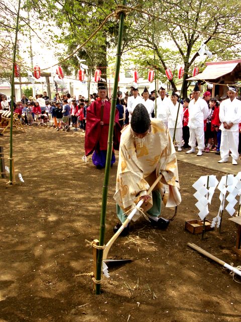概要 | この行事は、神社境内に四隅に竹を立ててしめ縄を張り、幣束を立てた3m四方位の斎田において、神官が祈祷を行った後、氏子により鍬入れ・種籾播き・施肥・田植えの4種類の所作が行われるもので、田起こしから田植えまでの過程が模擬化されています。 このお田植祭の起源は古く、地元に伝わる文書によれば、天正年間(1573~1591)の金山城主由良成繁の時代からとも考えられています。また、江戸時代の宝永7年(1710)の文書には、本行事の具体的な内容が記されており、これらにより約300~400年の長い歴史をもつ行事であることがわかります。 こうした「田遊び」に類する行事は、現在では群馬県内に5例(市内では唯一)しかなく、中でもこのお田植祭は伊勢神宮の御鍬祭の系統が考えられるものといわれ、本事例を含め群馬県内に2例(他の1例は、佐波郡玉村町の「樋越神明宮の春鍬祭」〔国指定重要無形民俗文化財〕)しか存在しません。また、県内の他の事例に比べ所作も具体的であり大変貴重な行事といえます。 【東長岡神明宮のお田植祭】太田市 |