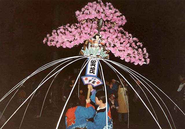 概要 | 龍舞賀茂神社の萬燈祭は、天保8年(1837)、京都の賀茂神社で奉納されていた萬燈をその御分霊であるこの賀茂神社で奉納したのが始まりといわれています。祭は、龍舞町の各コウチで製作した十数基の萬燈を賀茂神社に奉納し、神社境内や通りで萬燈を担ぎ振り回します。これを「振り込み」と呼びます。萬燈には、大萬燈(1基)と、小萬燈(13基ほど)があり、これらの萬燈が通りに並んで振り込みが行われる様子は壮観といえます。平成13年(2001)に県重要無形民俗文化財に指定されました。 【龍舞賀茂神社の萬燈祭】太田市 |