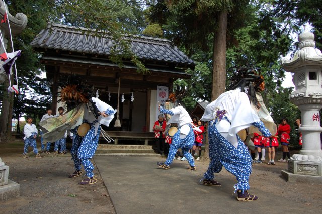 概要 | 新田氏の祖源義重は新田荘下司職に任じられ、保元2年(1157)に新田荘を領有し開発に力を尽くしました。その際に領内の8ヵ所へ八幡社を勧請して守り神としたと伝えられています。 赤堀八幡神社は、その一つであると伝承されています。赤堀ではこの八幡宮を中心として、例年10月中旬の日曜日に、伝統の獅子舞が奉納されています。 獅子頭には元禄年間(1688~1704)の墨書があることから、この当時から行われていたと推察されます。法眼・雌獅子・雄獅子の獅子頭を3人がかぶり、白の襦袢水玉模様の衿、紺の手甲、草履履きで盛装し、鳥居前で両端に万燈を立て、三つ巴になり庭廻りという踊りを笛・太鼓・唄に合わせて威勢よく踊ります。この踊りは、「ささら子」といわれ、12・13歳の子供が演じ、社前でも踊り、奉納します。 奉納舞が終わると大人に代わって村廻りとなります。村の中央墓地にある万日堂前で祖先に村内安全を祈り、本郷・下地区・上地区の順に万燈を先頭に笛・太鼓を叩きながら廻ります。以前は家々で踊っていましたが、今は村内を廻るだけとなりました。 万燈は色紙を割竹に飾り付けて、中央上部に4面を和紙で張り、ここに「五穀豊穣」「村内安全」などと書きます。村内を廻り終えると万燈を解体し、集まった人達に花のついた竹ひごを配ります。これを戸口につるすと悪魔除けになるといわれています。祭りが終わると後継者を選び、選ばれた子は笛係、歌係、踊り子に分かれ、先輩から稽古を受けて養成されます。 【赤堀八幡宮の獅子舞】太田市 |
