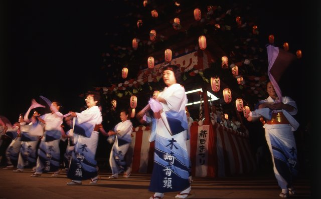 概要 | 木崎音頭は、戦前は木崎節と言われ、夏の盆踊りに唄われました。手ぬぐいで頬かぶりし、うちわで顔をかくし、「雨が3年 日照りが4年」と囃子に合わせて唄われ、一節歌うことに一廻りして次の文句を歌う流調な節回しでした。 日光例幣使道通行の際に大勢の若者が宿泊を余儀なくされ、旅籠屋ができ遊興の地となり、越後から多くの子女が奉公という名目で身売りされ飯売女として苛酷な生活をしいられました。彼女たちはこのさびしさから、故郷や家族をしのび、宴席で子供の頃覚えた歌を歌ったのが木崎節の始まりといわれています。 当時の歌詞は卑俗でしたが、戦後東京音頭が全国にヒットしたことから音頭と付く歌がはやり、その流れで木崎音頭へと変わり、踊りの振り付けや歌詞も昔からの節廻しを失ってしまいました。 八木宿で生まれた堀込源太は、馬方渡世で、木崎宿・八木宿間を往復し、木崎宿へ定宿を持ち、飯売女の歌をいつも聞いていました。源太は持って生まれた美声と歌好きで、木崎節を風土に合わせた威勢のよい節に替えて、生地の八木をとって八木節としたと伝えられています。源太は「源太一座」を組織し、周辺各地で興業し好評を博したといわれています。 木崎節が八木節の元唄であることは、多くの民謡研究家にも認められています。木崎音頭は、遠く三国の山を越えて来たまま再び帰ることなく、この地で亡くなった多くの子女の哀歌が秘められ、木崎宿がかつて宿場町であったなごりを伝えるものとして重要です。 【木崎音頭】太田市 |