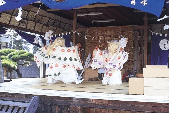 概要 | 明治44年に沼田警察署恩田駐在巡査を退職した松本耕三郎氏(旧群馬郡大類村出身)が硯田天満宮(菅原神社)の堂守となり、故郷大類村柴崎(現高崎市柴崎町)に伝承されていた伊勢系神楽を土地の青年に伝えた。以来組織された一座は、地元天満宮、三峰河内神社の祭礼を始め近隣の神社祭典に出張奉仕するようになった。最盛期は二十数座を持っていたが現在は技能者も減少、道具も破損してわずか十数座となってしまったが、格調も高く比較的原型も正しく伝えられている。昭和49年に保存会が組織され、昭和51年3月30日には沼田市の重要無形民俗文化財に指定された。昭和53年には硯田保存会が設立され、神社の春の祭典に神楽を奉納するとともにその保存普及に努めている。 【薄根太々神楽】沼田市 |