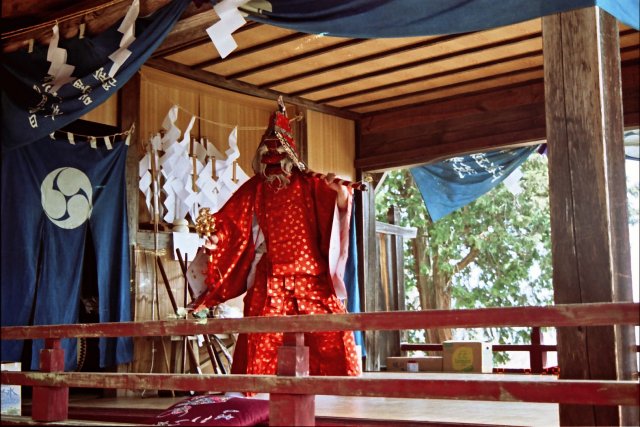 概要 | 明治44年に沼田警察署恩田駐在巡査を退職した松本耕三郎氏(旧群馬郡大類村出身)が硯田天満宮(菅原神社)の堂守となり、故郷大類村柴崎(現高崎市柴崎町)に伝承されていた伊勢系神楽を土地の青年に伝えた。以来組織された一座は、地元天満宮、三峰河内神社の祭礼を始め近隣の神社祭典に出張奉仕するようになった。最盛期は二十数座を持っていたが現在は技能者も減少、道具も破損してわずか十数座となってしまったが、格調も高く比較的原型も正しく伝えられている。昭和49年に保存会が組織され、昭和51年3月30日には沼田市の重要無形民俗文化財に指定された。現在毎月原町公民館で練習に励み、河内神社等で神楽を奉納するなどしてその保存普及に努めている。 【薄根太々神楽】沼田市 |