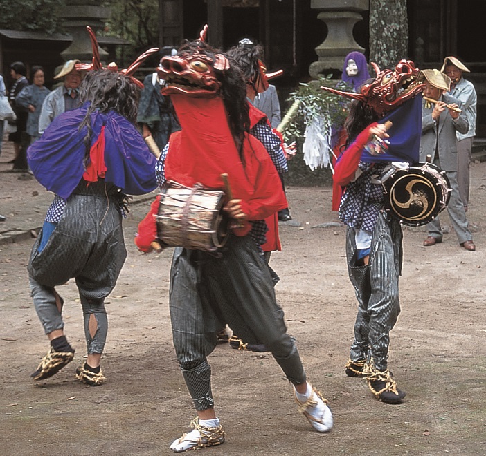 概要 | 古くから川島の諏訪神社に奉納された神事です。雄獅子・雌獅子・子獅子と添役に天狗やおかめが加わり、囃子・謡方の構成で演じられます。毎年10月の甲波宿禰神社の祭典で両社に奉納されています。渋川市指定重要無形民俗文化財(昭和47年10月20日指定)。 【川島の獅子舞】渋川市 |