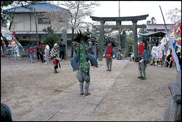 概要 | 一人立ちの獅子で、幕末から明治にかけて前橋市川原町から伝えられました。紺の唐獅子模様の衣装と腰太鼓と手にバチを持ち3頭の獅子が太鼓を打って舞います。カンカチが先頭に拍子を取ります。4月第2日曜日が例祭。渋川市指定重要無形民俗文化財(昭和45年6月27日指定)。 【箱田獅子舞】渋川市 |