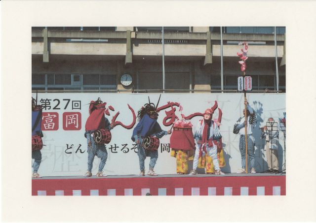 概要 | 内匠獅子舞はその昔羊太夫が当地に伝えたと言われ、以来神事として行われている。 諏訪大明神はその起源不明なれど鳥居建立記録によれば、 元禄の頃村人が官位頂戴の儀、元文3年(1738)に三原位正一位諏訪大明神の官納祭神事、大鳥居建立宝暦13年。安永6年は科様・吉井の争いで獅子留(止)めあるも古来通り行われる、と記されている。 竹川様御領地は、内匠・岩染・神成・邑楽郡5ヶ所で、内匠村は、公儀御用あづかりのため獅子舞の神儀は明治3年まで毎年続けられ、諏訪大明神・内匠城・不動庵・各組氏神様に数百年にわたり奉納され、内匠村氏子一同に伝承されており、内匠城(稲崎城)があることなど、この地方県内でも最古のものと思われる。 演目は、「小庭一代記」「鎮守参り」。 【堀柳金湯流あばれ獅子舞】富岡市 |