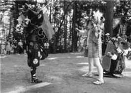 概要 | 当獅子舞は約300年前に天下泰平、五穀豊穣、部落繁栄、家内安全を祈念して伝来したと考えられる。 判官流判官派で太鼓を胸の高い位置に付け、腰を低く下げ、ゆっくりと「優雅に舞う」ことを基本としている。舞は前庭六場、後庭六場で、この間に舞児や笛吹は休憩を取る。 この休憩時間を利用して道化万才(恵比寿大黒)により場繋ぎを行う。 この道化万才(餅つき甚句と住送り)は、他地区の獅子にはないため珍しく、また面白おかしく演じられるので大変人気が高い出し物となっている。 昭和33年に靖国神社・明治神宮に群馬県代表として奉納したが、昭和35年頃か休止状態となった。昭和54年、吉井町文化会館落慶記念行事の群馬県選抜獅子舞大会出場を目指し復活し現在に至っている。演目は、振り込み、剣、大岡崎、しりこけ、かたまわりなど12演目。 【土塩上組獅子舞】安中市 |
