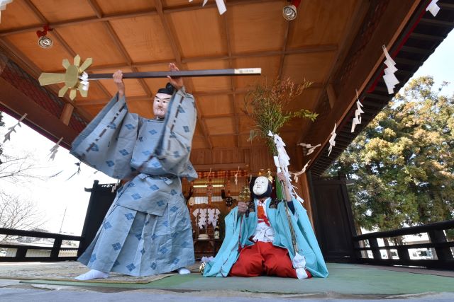 概要 | 三宮神社は750(天平勝宝2)年に創祀されたとの伝承を持つ古名社で、伊香保神社の里宮ともいわれている。三宮神社に伝わる太々神楽は、一時途絶えた時期もあったが、1947(昭和22)年地元有志により復活され、それ以来毎年春祭に奉納されている。町に唯一伝承される貴重な神楽である。演目には日本国の成り立ちに係る「戸開の舞」や「天浮橋の舞」がある。また、農事と深い係りのある「蛭児の舞」や「天狐の舞」もあり、その内容や舞姿は大変見事で興味深い。平成23年11月29日(吉岡町指定重要無形文化財) 【三宮神社太々神楽】吉岡町 |