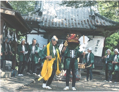 概要 | 吉井町上池の太々神楽は、有力者の新井喜三郎が上方より道具一式を購入してきて始めたと伝えられている。年代は不詳であるが、神楽(神楽の頭)を納める神楽堂に「明治11年新調」とあるので、それ以前から伝わるものと推察される。現在の神楽(頭)は、吉井町の援助で、平成18年に新調されたものである。 古来の神話に「神(天照大御神)が天の岩戸の中に隠れてしまい、世の中が暗く不安に満ちたため、お出ましを祈る神事として姫神(天宇愛売命)が面白おかしく神楽を舞ってお出ましになった」という話がある。上池太々神楽の神楽舞は、この姫神の舞を象ったものである。池にある大宮神社の祭神は天宇愛売命で、大宮神社の例大祭に氏子繁盛、五穀豊穣や雨乞い、疫病退散などを祈願して神楽舞が執り行われてきた。舞は、姫神(頭)が天の岩戸の前で時に巌かに、時に面白おかしく舞い、天と地と世の中の平安を祈り願う。後半、おとなしく眠っていると道化が現れ、賑やかにはやし立てるので、安眠を妨げられて怒るというものである。 【上池太々神楽】高崎市 |
