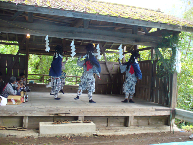 概要 | 由来は詳らかでないが、長野県の諏訪神社関係の人が明治の初めに、尾附(現、神流町)と川和に教えにきたと言われている。大正の半ば頃、獅子舞は廃れていたが、江川一松という目の不自由な人が笛をよく知っていて、村人にお囃子を教え獅子舞を復興させたと言われている。一人立で三頭の獅子舞である。宿から子供獅子がスリ出して七庭舞ってから集落を一巡し神社に行き、大人達と交替する。舞台で七庭舞い終わると神社から降りてきて翌年の宿にスリ込みをする。宿は順番に務めてきたが、最近ではスリ出しスリ込みはお寺を使うようになった。 【川和獅子舞】上野村 |
