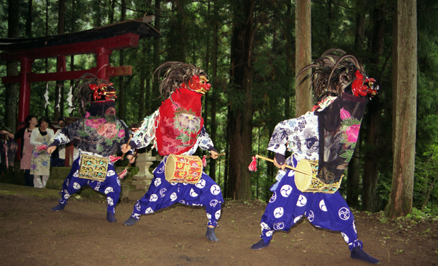 概要 | 塩ノ沢の獅子舞いは甘楽郡の大仁田から伝えられたもので「雲切り流」と言われている。獅子頭は、雌獅子1・雄獅子2の計3、雌獅子の頭・地は朱塗りで眼球と歯が金色、高さは20cmキャップ型口閉塞式、耳一木式、鳥毛飾りである。雄獅子の頭は高さが30cm、他は雌獅子と同じである。もとは多くの曲目を持っていたようであるが、現在は九庭しか舞えない。曲目は村内の他の獅子組と共通するものが多い。 1)ヒラ、2)森にてヒラ、3)ツクバ獅子、4)笹がかり、5)カラバツ、6)花がかり、7)女獅子がかり、8)天狗拍子、9)銀ぎゃく 獅子唄も多く残っている。唄を持っている獅子組はたくさんあるが、他に例を見ない、姑が嫁に難題を吹っ掛けた民話が唄になっている。筋は「岩を袴に縫え」と言う難題である。すると嫁は「縫いましょうから小砂を糸にして下さい」と返答したと言う話である。 【塩ノ沢獅子舞】上野村 |