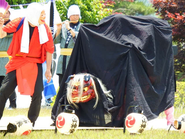 概要 | この神楽舞は、明治33年(1900)に「白倉の神楽舞」の演舞関係者により伝授された。白倉神社の例祭日に、養蚕・稲作等の豊作、天下泰平や家内安全等を祈って奉納されたと言われている。神楽舞は、基本的に三人立ちで、先頭の舞込に続き神楽堂、堂には太鼓が2個付き、笛9人、鉦1人、鼓2人、竹ささら5人等で構成され、演舞中に神楽唄が歌われる。演目は、岩戸開き・剣の舞の2座であり、道化のリアルな演舞で人々を笑わせる。平成11年(1999)4月27日町指定重要無形民俗文化財。 【大山の神楽舞】甘楽町 |