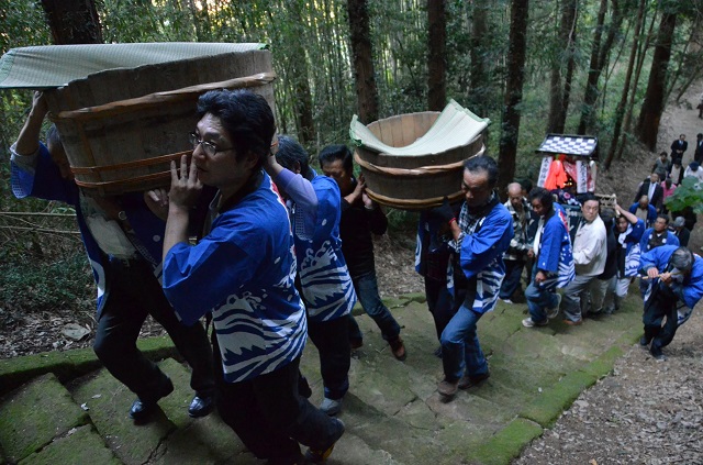 概要 | 麦供え(バクゾナエ)は、「麦(バク)まつり」とも「鬼穀(オニゴク)」とも呼ばれ、安土桃山時代この地で疫病が流行した時、氏子の代表者が諏訪大社に出かけて参篭し、厄除けの仕方を教わってきた。これが麦飯だったという。以来、諏訪神社の神事となっており、全国的にも珍しいものである。その方法は、籾殻をむいただけの大麦に小豆を混ぜ合わせ、釜で蒸して強飯をつくり、直径約1mの半切(おひつ)に入れ、「エイトー、エイトー」という掛け声をあげながら、担いで神社へ運び神官がこれを拝んでから氏子たちに授ける。平成24年(2012)県指定重要無形民俗文化財。 【天引の麦祭り】甘楽町 |