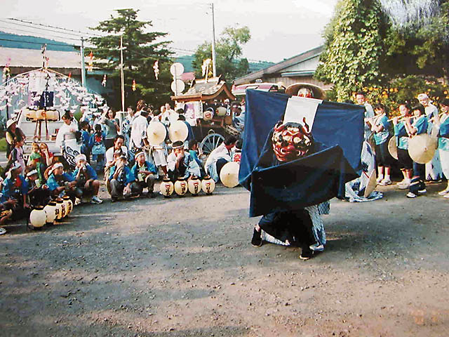 概要 | この獅子舞は今より三百年程前から始まったといわれるが、明治10年(1877)頃大笹の佐藤定治外3名で信州小県郡十林寺で行われていたものを習って来て大笹の獅子舞とした。 午前10時から、神社での神事のあと、地区内へ出て、地区内7、8カ所の広場で獅子舞を行い、地区内を廻る。最後に神社で神事を行って解散する。 楽器は笛(7穴)一本、つけ太鼓一つ、大胴一つ道中を屋台でひくときは屋台の後に大胴と締太鼓をつけ、一人が二つを打つ、舞のときは大小一人ずつで奏する。笛を芯にして大胴が右、締太鼓が左に位置した。笛は神楽笛を奏して実に美しい音である。 【大笹神社獅子舞】嬬恋村 |
