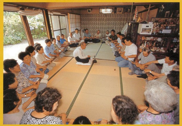 概要 | 「百万遍」の由来は、元弘元年(1331)京都において大地震が発生し、その後、疫病が大流行した際、これを憂いた後醍醐天皇より命を受けた、知恩寺第八世善阿上人が御所の紫宸殿(ししんでん)に7日間籠もり、疫病退散の為に弥陀宝号(南無阿弥陀仏の念仏)を百万遍唱えたところ、疫病は治まりその効によって天皇より「百萬遍」の号を賜わった事から始まる。 現在も、知恩寺で行われる百万遍念仏といえば、善男善女が寺院の本堂に円座して中央に導師を迎え、大数珠を繰りながら念仏を唱える。 研究者の間では、これを「京都智恩寺型百万遍念仏」というが、「平五良の百万遍」もこれと同様に、輪の中央に音頭取りが座り、長さ約15m・数珠玉数約200個の大数珠を鉦を叩きながら、大人数で「ナムアミダブツ・ナンマイダ」と唱和しながら数珠玉を手送りするものである。 【高橋平五良の百万遍】東吾妻町 |