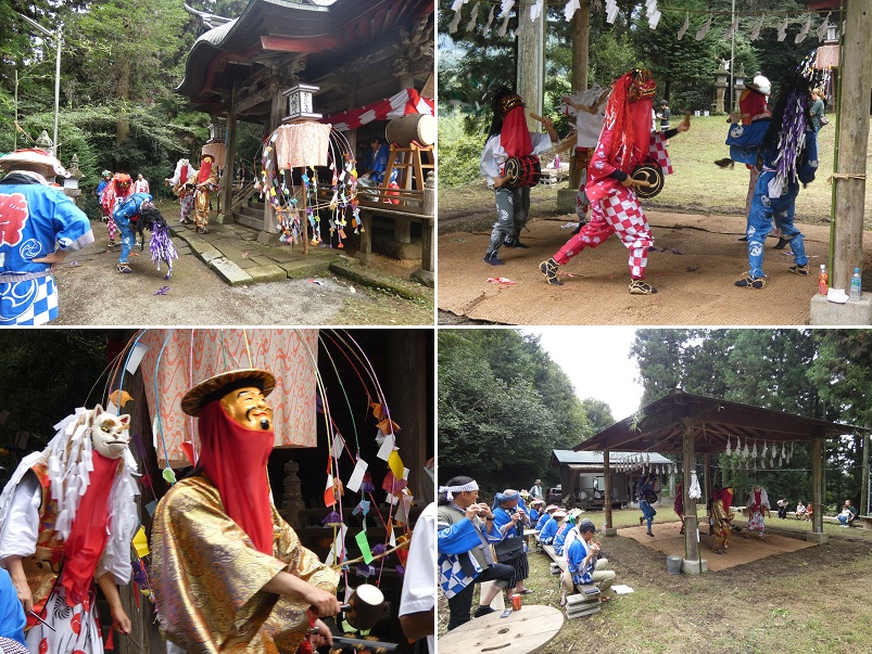 概要 | 泉沢の獅子舞は約350年ほど前の江戸時代よりの伝統を持つといわれ、正式な記録がないのが残念であるが太平洋戦争中も休むことなく続けられ、泉沢地域の家内安全と五穀豊穣(天下泰平)を祈願して奉納されてきた。八幡神社宝として鉄扇と以前の獅子頭があり、桐を薄くくりぬいた白木の面に毛を植え込んだ跡があり鼻は大きく全面的に四角い重箱型であり、よほどの名人の作品と思われる。 冊子「榛名町の獅子舞」の斉渡北野神社獅子舞の項に「今より約200余年前の天明年間の頃、信州より吾妻郡を経て当地方に伝わり 、斉渡村北野神社獅子舞として定着……」とあり古くより泉沢八幡宮獅子舞、大戸古賀良神社の獅子舞との舞の交流があり、泉沢でも明治時代、斉渡より師匠を迎え、長い間に振り崩した獅子舞を正統なものに直したということである。 今現在の資料によると、曲名、題名、唄等似ているものが多くあり、長い年月の語り継ぎの中で少しずつ変化していったと考えられる。 流派は三国判官流といわれる。 演目は、「振込」「辻がため」「おかざき」「トヒャリ三国獅子」など。 【泉沢獅子舞】東吾妻町 |