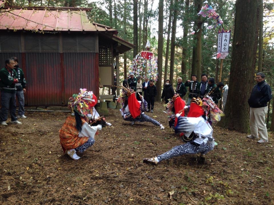 概要 | 流派は三国法眼流。 獅子舞がいつ頃からはじめられたかは定かではないが、口伝によると、往古上大戸に諏訪神社があり、本殿修復のため境内の大木を処分した際に、売上金の一部で獅子頭を購入した。村民の家内安全と五穀豊穣を神社に祈願する折りに獅子舞を奉納したのが始まりで、およそ300余年前と言われている。 前群馬郡榛名町斉渡の「北野神社奉納獅子舞」の口伝に、天明年間の頃に、信州より吾妻郡を経て当群馬郡につたわるとのこと。 そのため古くから吾妻郡の泉沢や古賀良神社獅子舞と舞の交流があったといわれている。 村に居住する長男、または次男を主体として行い、稽古は、当番にあたる宿の土間や板の間で厳しく行われていたが、晴れの舞台となる祭礼当日は、指導者は振り子に対し一切の苦言は申さなかったという。 残念ながら後継者不足にて12年の中断があったが大戸区全体に呼びかけ、昭和62年に獅子舞保存会が結成され復活となり現在に至っている。 演目は、宮振り、どじょう猫、岡崎、デンヂ、チャーリャウトなど。 【古賀良神社獅子舞】東吾妻町 |