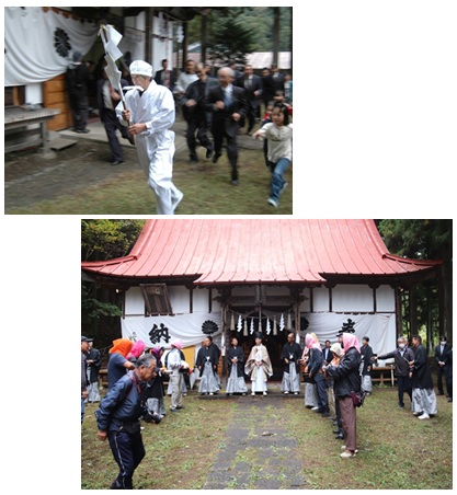 概要 | 片品の猿追い祭りは花咲地区の武尊神社で行われる祭りで鍛冶屋集落をはじめとする6集落が参加し、その集落の中のイッケという同族集団が役割分担しあいながら行われる。特長として 1.役員が東西に分かれ着座し、謡いが行われること。 2.白装束の猿役をサカバン、ヒツバン等が神社の回りを3周追いかける。 3.サカバン(甘酒担当)ヒツバン(赤飯担当)を集落ごとに当番でつとめる。 この行事は猿の害を防ぐために始まったとの伝承が伝わっている。 【猿追い祭り】片品村 |
