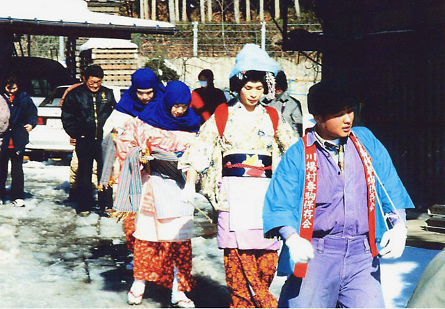 概要 | 明治の初期、隣村である白沢村岩室の旅芸人一家が門前地区を訪れては養蚕の豊作を祈る踊りを披露していたが、この一家に病人が出て中止された年の養蚕が不作だったため、同地区の青年が旅芸人の替わりに女装し、「春駒」の踊りを引き継いだ。平成11年(1999)に県重要無形民俗文化財の指定を受けた。 【春駒】川場村 |