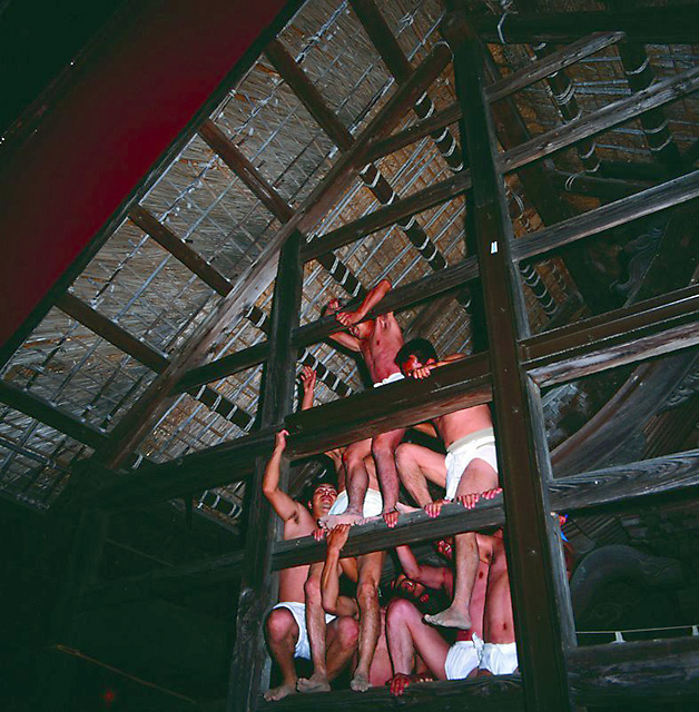 概要 | この祭りは、小川島地区の氏神様の秋祭りに行われる400年の伝統をもつという勇壮な裸祭りである。地元の男子十数名が、ふんどし姿で数珠つながりになって、鉦叩きを先頭に大蛇のように練り歩き、引き合い押し合い、駆け回り、はい回り、寝そべりなど7回繰り返した後、大鈴をもぎ取る。ヤッサとはアサという掛け声から名付けられている。五穀豊穣、無病息災、水害除けを祈願する。 【ヤッサ祭り】みなかみ町 |