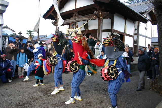 概要 | 稲荷流に属する獅子舞で五人の獅子と笛数名で構成される。 祭り当日は獅子宿である上新田公民館で「三拍子」などを舞った後、稲荷神社へ向かい神前で「剣の舞」を奉納する。その後「街道下り」として県道142号線を往来し、上新田地区の東西両端で四方固めの舞「ボンデン」を行う。 【稲荷神社獅子舞】玉村町 |