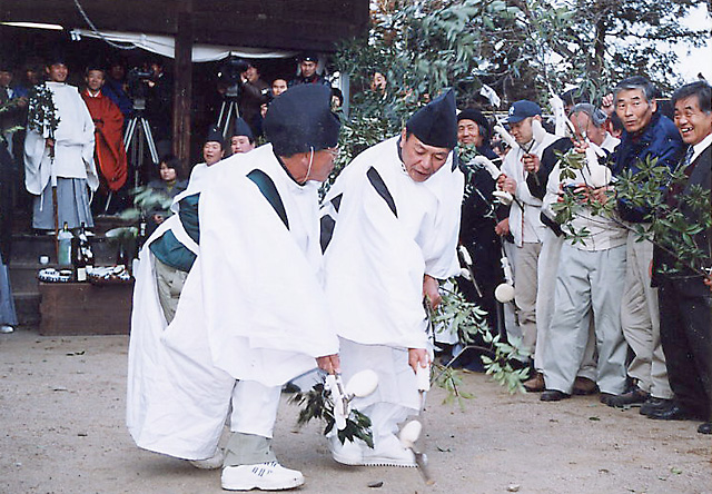 概要 | 春鍬祭は樋越にある神明宮に古くから伝わる祭りで、その年の豊作を予祝して行う田遊びの神事である。平成14年(2002)2月に国指定重要無形民俗文化財に指定された。まず、神明宮の拝殿で神主・祢宜・氏子総代・鍬持たちにより祭典が行われる。その後、6地区(原、森下、上樋越、中樋越上、中樋越下、下藤川)から選べばれた鍬持が各々手に榊または樫の枝に餅をつけ鍬に見立てたものを持ち、拝殿の前にコの字に並ぶ。作頭の指図により鍬持が「クロヌリ」の仕草をし、水をまわす仕草として一升瓶の神酒をまわし飲みする等の所作が行われる。次に祭典長役の祢宜が頃合いをみて「春鍬よーし」と叫ぶと、一同が「いつも、いつも、もも世よーし」と唱和しサクを切るまねをする。これを3回繰り返すと観衆が鍬を奪い合う。その鍬を家に飾っておくと、養蚕があたるという。最後に神前に供えた切り餅やミカンを群衆にふりまくが、この中には稲穂のついたままの初穂が混じっている。初穂を拾った人の家は豊作間違いなしと言われている。 【春鍬祭】玉村町 |