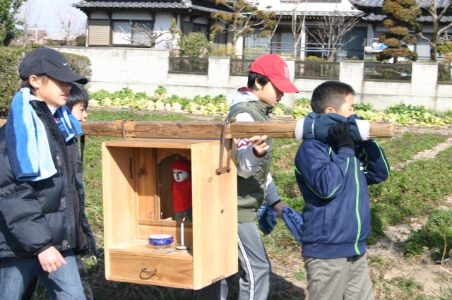 子供たちが地蔵を担いで地区内をまわる (玉村町教育委員会提供)