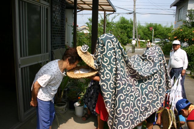 概要 | 悪魔祓いは藤川にある稲荷神社の境内に祀られている八坂神社の祭りである。氏子である藤川(下藤川を除く)地区と飯塚(西組)地区の人たちによって毎年7月24日に行われる。この祭りで使われる獅子頭は俵端を2つ重ねて結び、赤い紙で舌をつけ、半紙で目と鼻と耳をつけ、唐草模様の大風呂敷をつけてできあがる。祭り当日、子どもたちが稲荷神社に集まり、獅子頭をかぶった子を中心に1mほどの篠竹に御幣をさげたものや小太鼓・布の袋を持った子どもたちが、これを振り「悪魔っぱらい、悪魔っぱらい」と叫びながら、地域の各家をまわり、人々の頭を獅子頭ではさみ、悪魔をはらう。 【悪魔祓い】玉村町 |