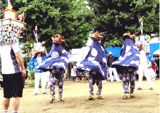 〔写真は板倉町教育委員会提供〕獅子組は祭り宿で身支度をします。宿の庭、薬師様前、村鎮守長柄神社前などで舞踊し、村境で辻固めをします。ここでは、花笠を被った人が四隅に立って庭(シバ)と呼ばれる〔踊り場〕をつくり、その中で雌獅子・雄獅子・中獅子が、舞っています。