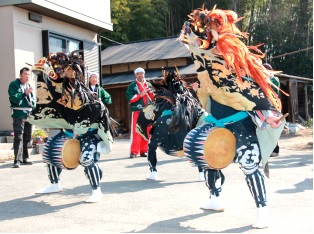 〔写真は板倉町教育委員会提供〕獅子頭は、赤獅子(母親)、大獅子(父親)、中獅子(子)の3体です。 大徳院より出発し、各家や社寺等で摺り(舞踊し)、疫病神(流行病・病害虫・災難等)の入村を封じるため厄神除札を立て、耕地境4箇所で辻摺りをします。