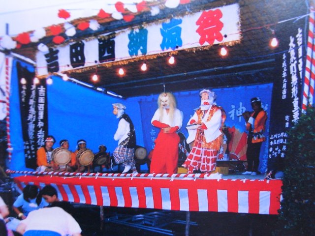 概要 | この里神楽は、伝承によると江戸時代末期から明治初期頃に始められたといわれ、出雲流神楽に演劇性の高い江戸神楽や神話的要素の強い岩戸神楽、さらに太々神楽等の要素を取り入れた東毛地方に分布する神楽の系統に入るものとされている。 特に会話を交える特徴を有し、古くから春秋の祭りには上演され庶民の楽しみとされていた。演目には「三番叟」「岩戸開き」「にんば(種まき)」「えびすさま」「刀鍛冶屋」「ひょっとこおかめ」「狐つり」の7つがある。昭和59年10月12日町の重要無形文化財に指定。 【吉田西里神楽】大泉町 |