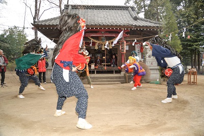 概要 | 大八木町諏訪神社獅子舞の起源は、古文書等が残されておらず不明であるが、大八木町諏訪神社が「信州諏訪」「和州高市郡天の香具山」「濃州醒ヶ井の日本武尊」の三ヵ所から分霊を移した時に獅子舞を奉納したとあり、現在使用している獅子頭の裏に、墨書で「宝暦10年10月7日当国碓氷郡下豊岡村彫刻師鈴木与七作」と書かれていることから、少なくとも宝暦10年(1760)以前には獅子舞が行われていることが分かる。また、それ以前に作られたと思われる獅子頭も見つかっており、現在は修理し、二組の獅子頭が使用されている。 近隣の獅子舞と違い舞の構成など戯曲化されておらず、農耕民俗芸能の特長をよく残している。流派は判官流。一人立連舞形式で笛方の曲に誘導されて獅子自らが腰の太鼓を打って舞踏する。 通常は赤鬼、青鬼の2人が舞の開始前に霞新流の棒術を行い、大黒様の悪魔祓いのかけ声に舞方が円形を成し、舞を行う。舞は獅子頭をつけた前獅子・中獅子・後獅子の3人と、天狗面と鳥甲をかぶったカンカチ1人、大黒面をつけた大黒様1人の5人で構成される。 【大八木町の獅子舞】高崎市 |
