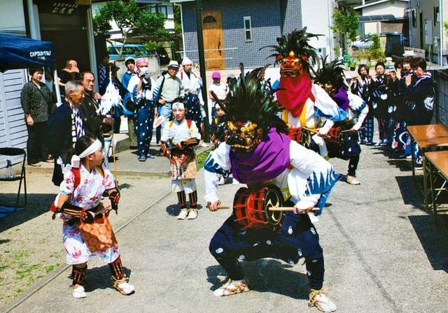 概要 | 江戸時代中期から伝わる田子屋の獅子は、災害、疫病除け、雨乞いなどに霊験があると言われ、古文書には「天保の大干魃」「安政の三日コロリ」等の時に倉賀野中を振り巡り、災厄を逃れたとの記述があります。 流派は日本古来の形をとどめる天下一角兵衛流で、高崎市内では、田子屋のほか天保3年に田子屋から分家した上中居町だけがその名を名乗っています。他の地域の獅子舞の曲数が25曲程度であるのに対し、田子屋には75曲もの曲が伝承されています。 後継者不足のため十数年途絶えた時期がありますが、平成17年秋の倉賀野神社750年祭を機に復活し、現在では春秋例大祭に奉納されるほか、地域の行事等で演舞しています。 【倉賀野町田子屋獅子舞】高崎市 |