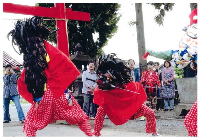 概要 | 高崎市飯塚町に常福寺という古い寺があり、戦国時代の飯塚城跡に建っている。この寺の参道脇と村里をはなれたところに2つの薬師堂がある。 そして飯塚城跡のすぐ隣に飯玉神社があり、この神社は、旧上飯塚村・下飯塚村の総鎮守である。 毎年4月8日の両薬師如来の祭り直後の日曜日、10月19日の飯玉神社の例大祭直後の日曜日に獅子舞を奉納している。 飯塚町には、長泉寺という寺があり、江戸時代にこの寺の和尚(大臥佑道師や機外了禅師)が寺子屋の子ども達に獅子舞を指導したのが始まりといわれている。長泉寺で行われていた獅子舞が、その後、飯玉神社の祭礼に奉納されることになった。その発端は天明年間のことであるといわれている。 飯塚の獅子舞は、稲荷流。三頭の獅子(法眼・中獅子・後獅子)と冠勝(カンカチ=天狗)、大黒天、そして二人の棒遣い(赤鬼・青鬼)の七人構成。かつてはこのほかに法螺貝を吹く山伏がいた。獅子は太鼓をたたき、冠勝はカネの棒を打ち鳴らし、大黒天は軍配と枡を持って世の雑事の調停にあたる。棒遣いは露払いの役で先頭に立つ。現在、法螺貝は保存会の役員が吹いている。地域の五穀豊穣、災厄退散を祈念して舞っている。 今日、「梵天がかり」「花吸い」「三拍子」「新きり」「剣の舞」「網きり」「女獅子がくし」の7つの演目と48種の曲目が伝わっている。棒遣いには5種類の棒術が伝わっている。 平成23年4月20日 高崎市重要無形民俗文化財指定 【飯塚獅子舞】高崎市 |