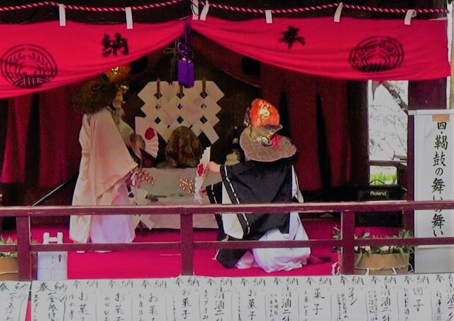 概要 | 烏子稲荷神社の太々神楽の起源は、 元禄2年(1689) に神主の山田和泉守の次男である山田権平藤原秀基を新宅に出す際に太々神楽の主人となってこれより先、 引き継いでいくようにと命じた記録が残されている。また、永禄6年(1563)に武田信玄が箕輪城を攻略後に新しく社殿、 神楽殿を造営したことが古文書に書き記されている。 しかし、伝承ではさらに古く、鎌倉・室町時代まで遡ると伝えられている。 昭和の前半までは3月15日の春祭りで3日間神楽の奉納が行われ、地元の人たちや他地域からたくさん人が参拝に来て、 大変賑わっていたという。 当時の演目は36座あったが、 現在と座数の数え方が異なるので比較できないが半数が継承されてきた。 現在継承されている演目は先代の人たちの知恵により見事に現在に合うよう凝縮され、 コンパクトに構成されている。 その構成は大きく分けて式舞と興舞と稲荷神 (宇迦之御魂命) の3部からなる。 【烏子稲荷神社太々神楽】高崎市 |