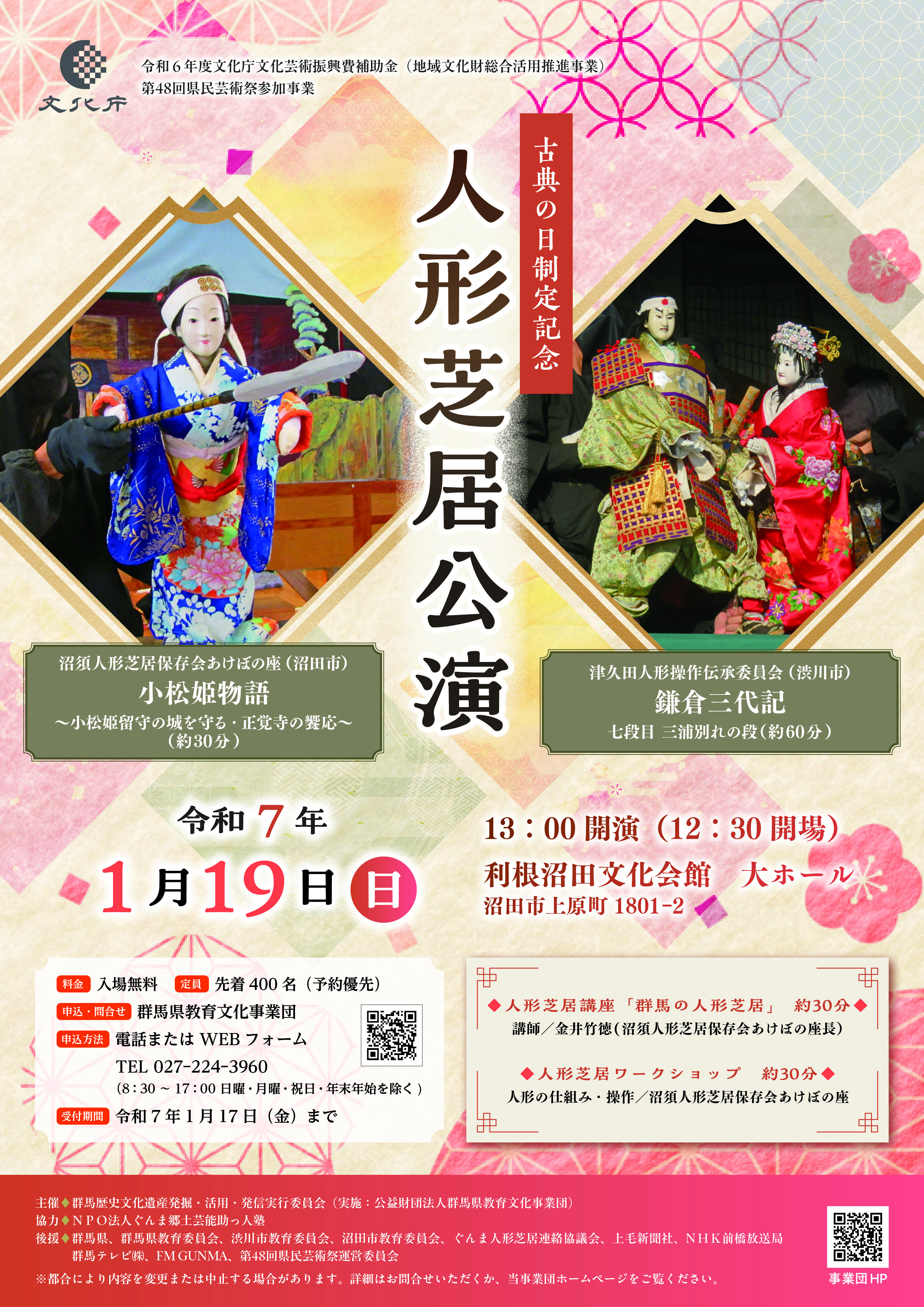 ❉申込み・問合せ❉ (公財)群馬県教育文化事業団[027-243-7200 事業支援課(直通)]8:30~17:00(年末年始・日曜・月曜・祝日及び月曜日が祝日の場合は翌火曜日を除く)